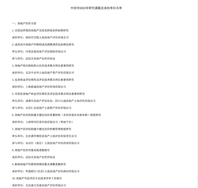 为了加强房地产估价、经纪和住房租赁相关问题研究,中国房地产估价师与房地产经纪人学会(以下简称中房学)于今年5月23日发布了《关于公开遴选2022年研究课题承担单位的公告》,向社会公开遴选课题承担单位。根据公平、公正、科学、择优的原则,中房学综合考虑对课题研究目的的理解、研究内容、研究团队、研究基础、申报单位综合实力以及已有成果的意义和质量等情况,研究确定其中:《住房租金评估情形及评估技术要点和注意事项研究》课题由联城行作为课题承担单位。(详见官网;http://www.cirea.org.cn/content/7852)