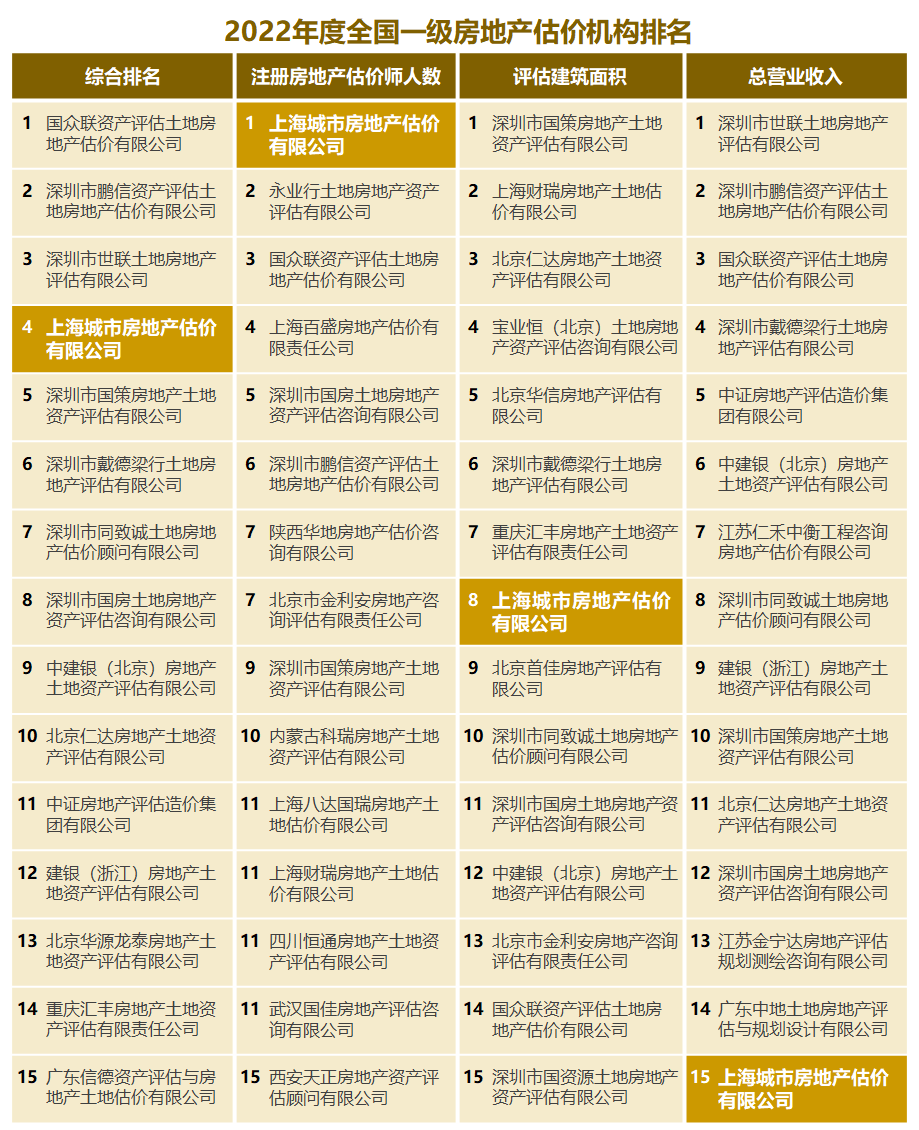 2023年3月31日,中国房地产估价师与房地产经纪人学会公布了《2022年度全国一级房地产估价机构排名》。值得一提的是,我司“综合排名”位列全国第四、上海第一,并取得“注册房地产估价师人数”全国第一的好成绩,在其他单项指标的排名中亦名列前茅。