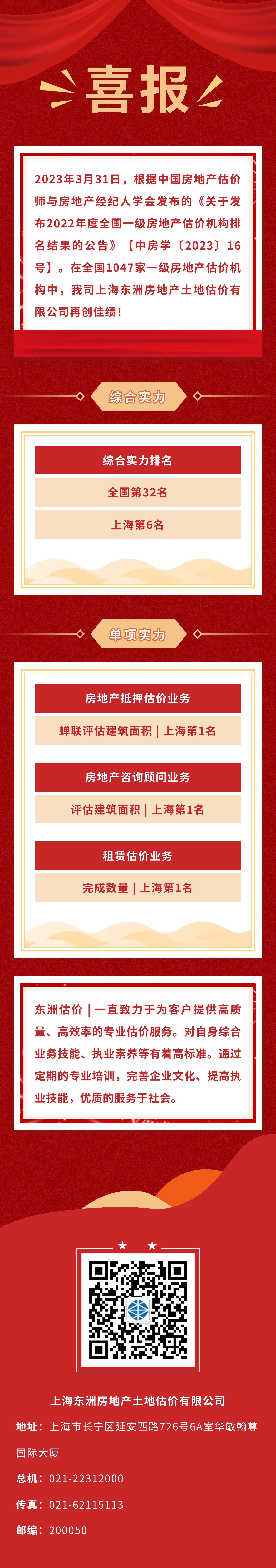 2023年3月31日,根据中国房地产估价师与房地产经纪人学会发布的《关于发布2022年度全国一级房地产估价机构排名结果的公告》【中房学〔2023〕16号】。在全国1047家一级房地产估价机构中,我司上海东洲房地产土地估价有限公司再创佳绩!