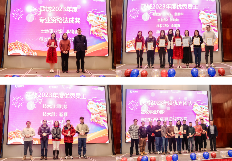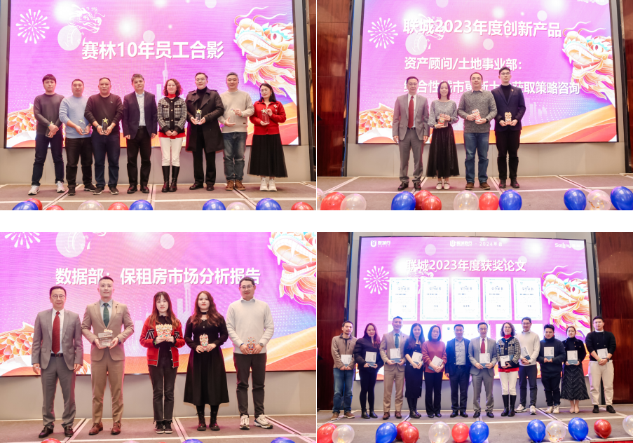 2023年取得的丰硕成果离不开大家的努力,在表彰环节,我们为那些在过去一年表现卓越的员工和团队颁发了荣誉奖项。包括专业资格达成奖、2023年度优秀员工、优秀团队、赛林10年员工奖、创新产品以及联城2023年度获奖论文表彰。