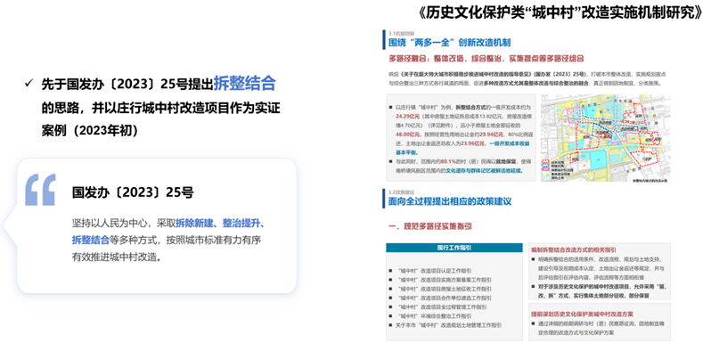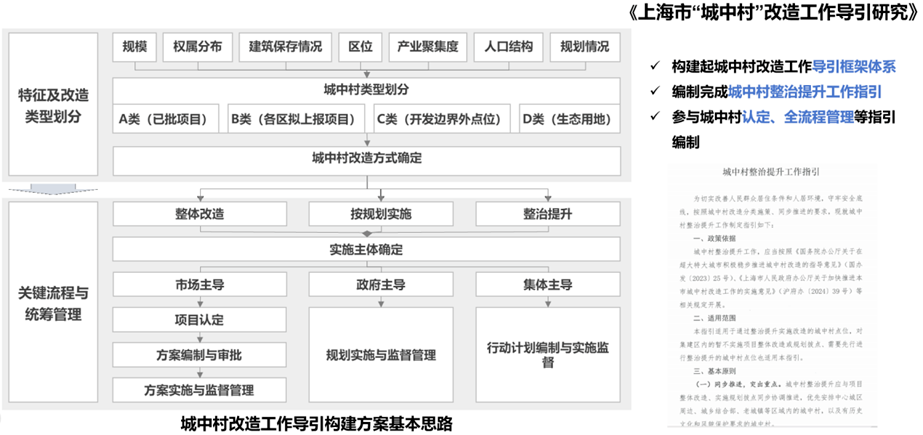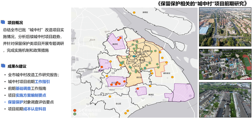 我们承担了多个市级层面的重大课题与政策研究,如《上海市“城中村”改造工作导引研究》、《保留保护相关的“城中村”项目前期研究》、《历史文化保护类“城中村”改造实施机制研究》等;参与了嘉定、奉贤、金山等多个区的城中村改造三年行动计划编制,为政府决策提供了支撑,为上海城中村改造工作献计献策。