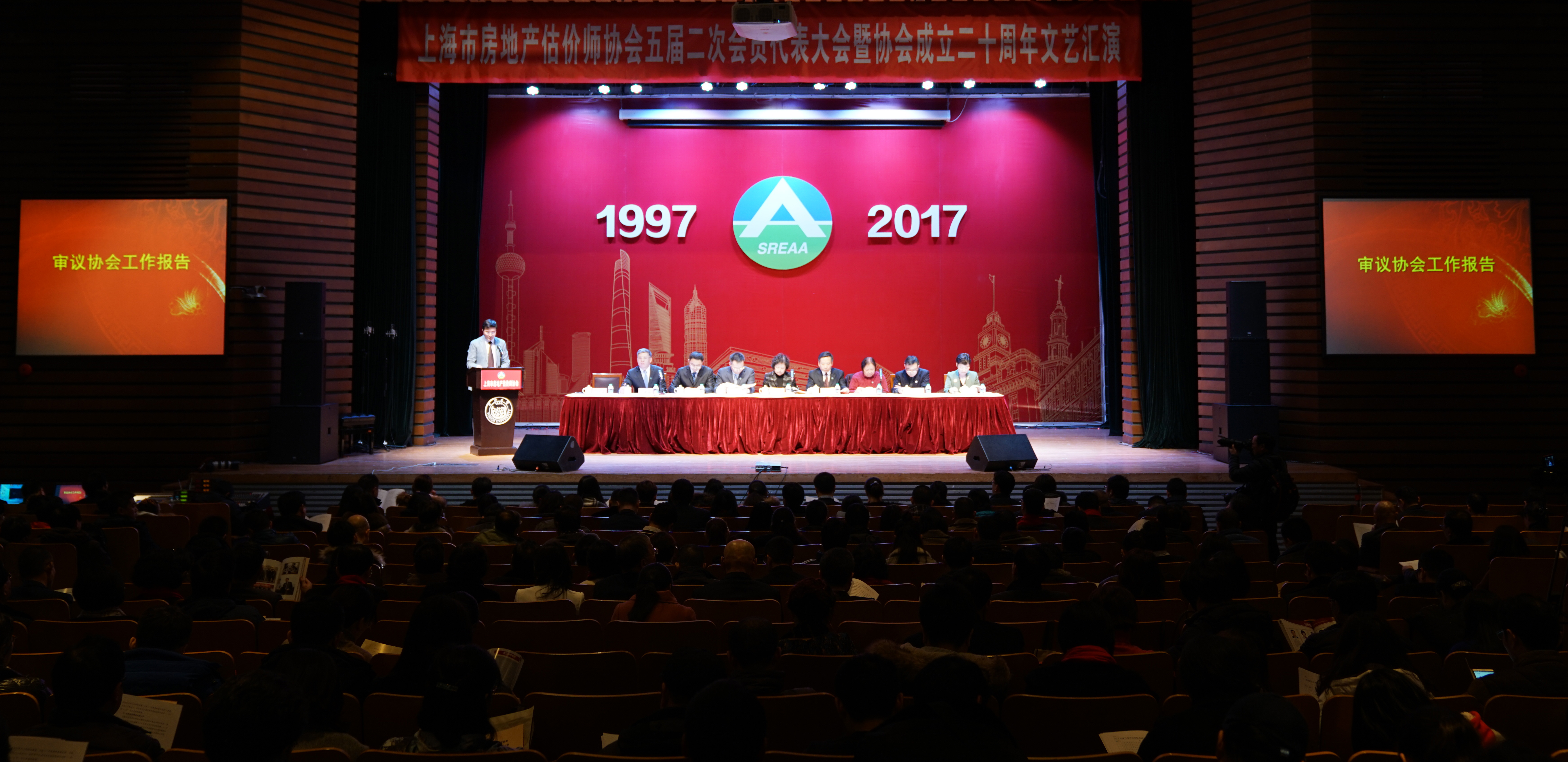 2017年1月12日下午,协会假座同济大学129礼堂举办协会第五届第二次会员代表大会暨协会成立20年文艺汇演活动。主席台就坐的嘉宾有中国房地产估价师与房地产经纪人学会会长杜鹃,市住房和城乡建设委员会朱育德,市社会工作党委赵永庆,市社团管理局徐国芳,协会名誉会长、专家委员会主任顾弟根,协会老领导、专家委员会顾问吴赛珍,轮值会长丁光华、樊芸,常务副会长邵晓春。其他参会嘉宾还有中房学、市住建委相关处室、事业单位、兄弟协会、同济大学等单位的领导,各机构会员代表,“行业贡献”获奖者,先进单位和先进个人的代表,以及参加汇演的演职人员、志愿者等400余人(其中正式代表193人,出席率98.9%)。丁光华主持会议。